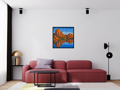Bring the tranquility of the desert landscape to life with this stunning brick mosaic kit, featuring majestic red rock formations perfectly reflected in calm waters beneath a vivid blue sky. The mirrored composition creates a sense of harmony and balance, making it a captivating piece for nature lovers and art enthusiasts alike. This DIY kit includes all the Lego-compatible bricks and step-by-step instructions needed to build it yourself, and is available in multiple sizes to suit any display space.